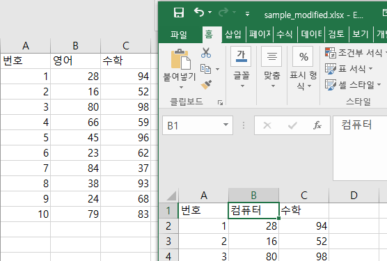 이제 새로 저장된 sample_modifiex.xlsx 파일을 열어 확인해 보자.