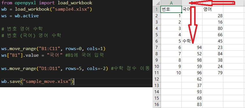 move_range()를 활용하면, 해당 범위의 셀 내용을 특정 위치로 이동 시키는게 가능하다.