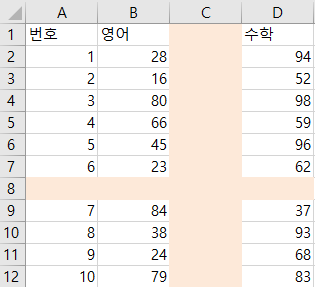 엑셀 프로그램에서 삽입하는 것처럼 삽입이 실행된 열과 행의 내용들은 아래와 좌측으로 밀려난다.
