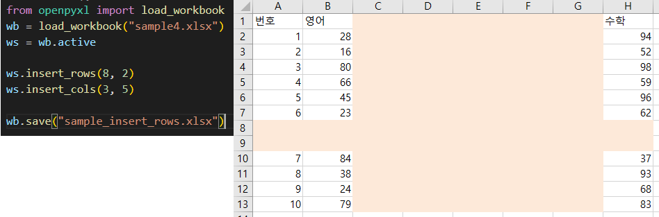 각각 insert_rows 와 insert_cols 를 사용행 행과 열을 추가할 수 있다.