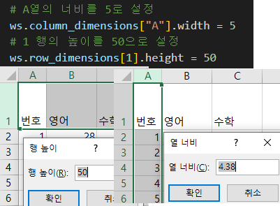 높이는 50으로 설정한 값에 맞게 변경되었지만, 너비의 경우 4.38로 되어있다. 다른 정수값을 넣어보았지만... 실제 엑셀에서는 소수점으로 된 값이 보인다.... 왜 그런지는 구글링을 통해서도 해결하지 못하였다.