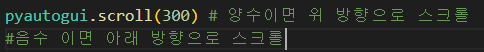 scroll()을 사용하여 마우스 가운데 휠 움직임을 조작할 수 있는데, 이때 전달되는 값에 따라 이동 방향이 결정된다.