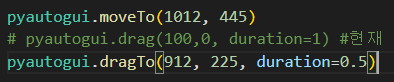 이러한걸 또 한줄에 작성할 수 있게 drag()가 있다. 이때 duration 설정을 해주지 않으면 너무 빠르게 움직이기 때문에 컴퓨터가 인식을 못하는 경우가 생긴다.