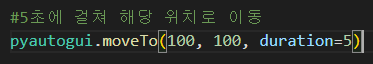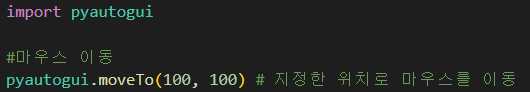 마우스를 이동시키려면 pyautogui.moveTo() 로 좌표를 설정하여 마우스를 해당 좌표로 보낼 수 있다.