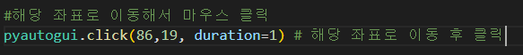 이제 pyautogui.click()을 이용해 좌표를 설정해주면, 해당 좌표로 마우스가 이동 후 클릭되는걸 확인 할 수 있다.