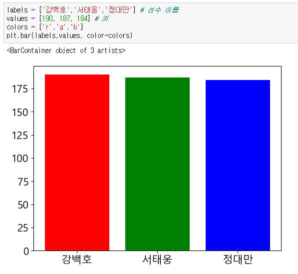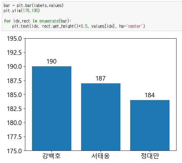 따라서 text()로 글자가 표시될 위치 좌표는 idx(x좌표), rect.get_height()+0.5 (y좌표)가 되고, 이때 각 '키'값이 표시된다.