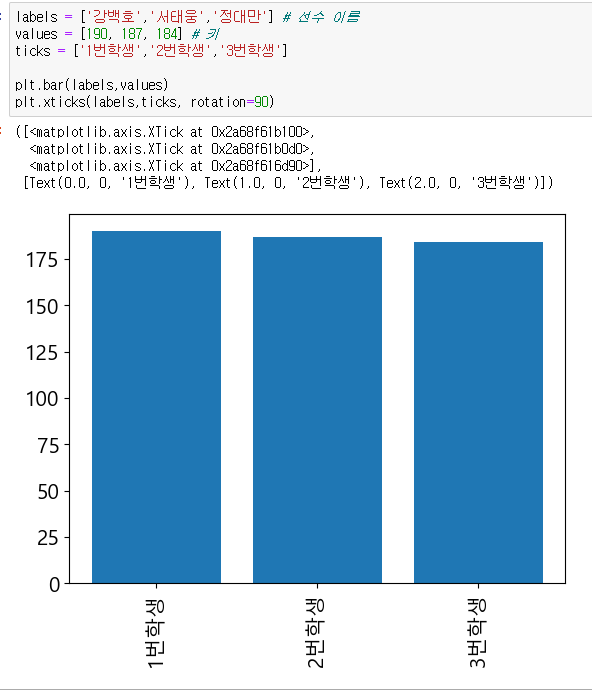 만약 x축의 ticks값들을 새로 설정해주고 싶은 경우네는 xticks()에 새로운 변수(리스트형)로 전달하여 사용 가능하다.