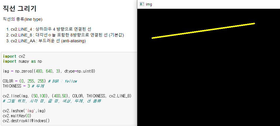 직선은 3가지 옵션값이 존재한다. 먼저 기본값 cv2.LINE_8을 이용하여 직선을 그려 보았다.