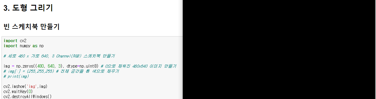 np.zeros()함수를 이용하면 지정된 영역에 모두 0 값으로 채워줄 수 있다.RGB에서 0,0,0 은 검은색을 의미한다.