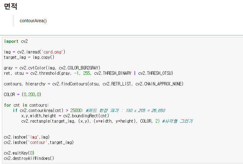 윤곽선이 그려진 면적을 구하는건 cv2.contourArea()함수를 이용한다.