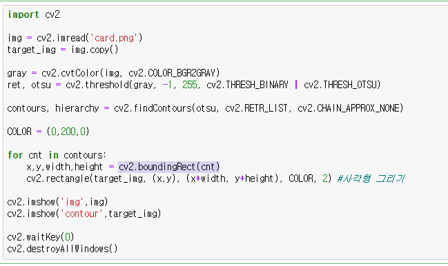contours에 저장한 외곽선 정보를 for문을 통해 반복해 주고, cv2.boundingRect()를 이용하여 해당 값들을 추출해준다.
