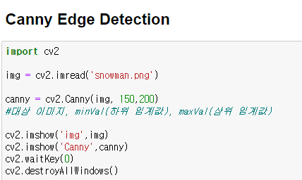 cv2.Canny()함수는 총 3개의 인수를 전달받아 사용하는데, 첫번째는 대상 이미지, 두번째는 하위 임계값, 세번째는 상위 임계값이다.