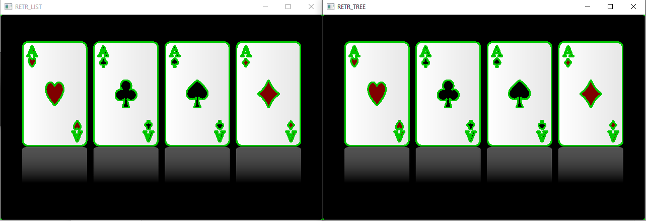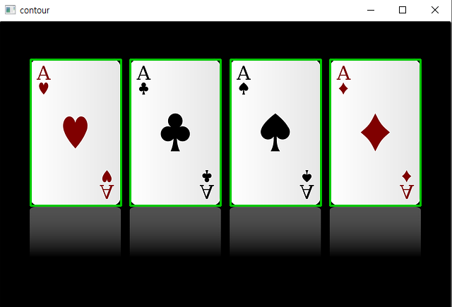 검출된 외곽선을 확인해보면, 안쪽 무늬와 'A'에는 외곽선이 검출되지 않았고, 카드 4장의 외곽선만 검출 되었다.