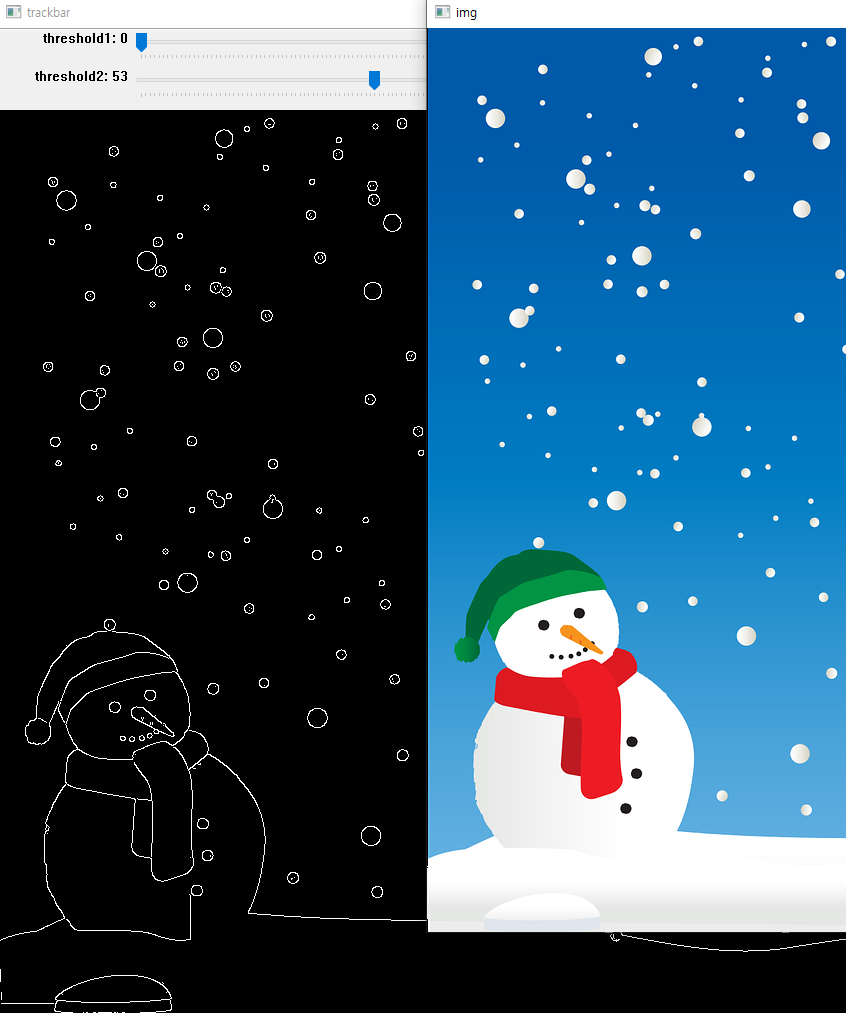 검출된 이미지를 살펴보면, 원본 이미지의 눈사람 아래 눈은 외곽선으로 그려지지 않았다. 즉 설정한 하위 임계값 보다 낮은 색변화인 것이다.